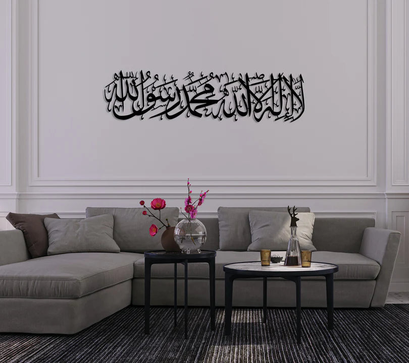 This wall decor, adorned with the First Kalima "There is no god but Allah, and Muhammad is His messenger" in horizontal Islamic calligraphy, symbolizes both unity and eternity in Islamic culture. Ideal for Ramadan Decor, Eid Mubarak, or as a thoughtful Muslim gift, it enhances home decor with its beautiful Islamic design. See other Islamic Wall Decors by clicking here!