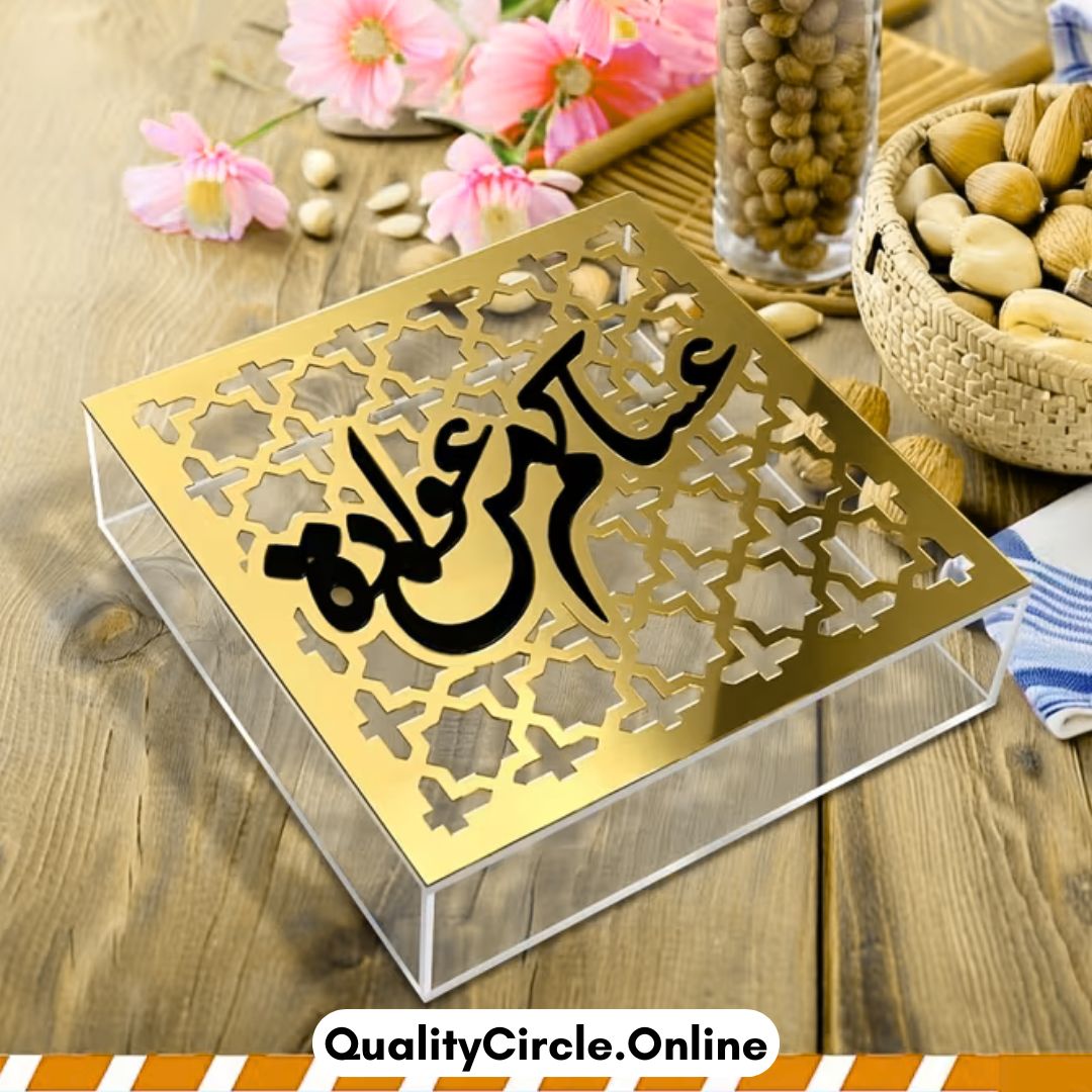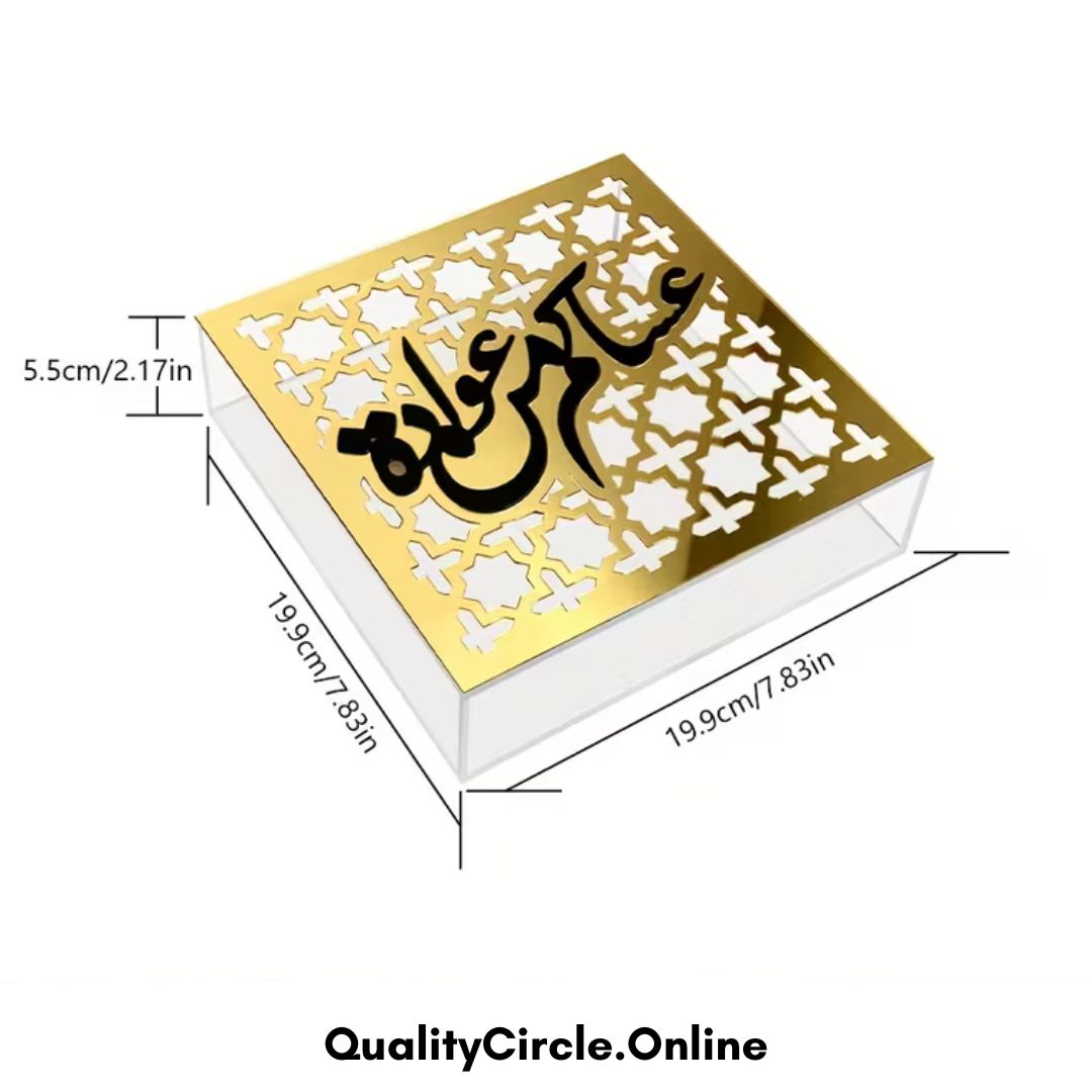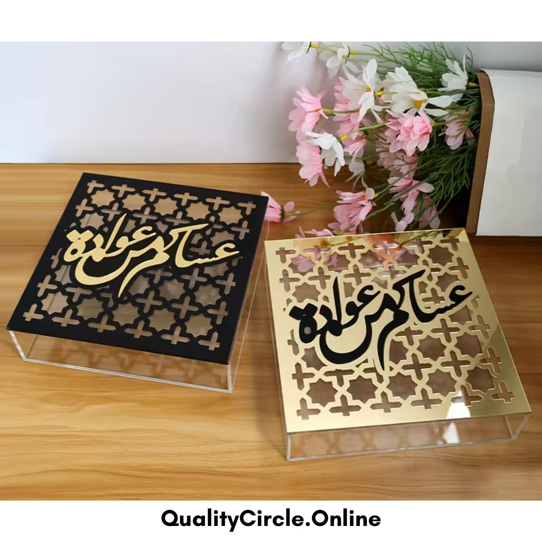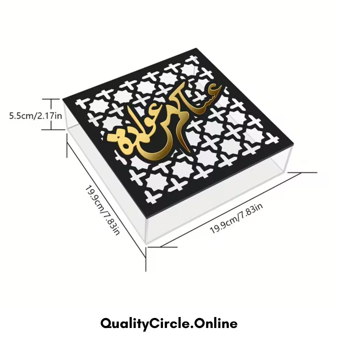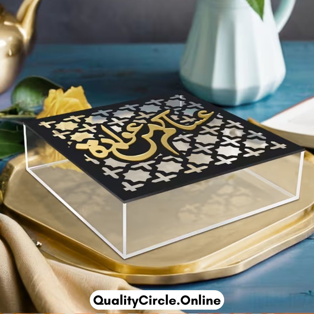 Acrylic box with golden Arabic calligraphy, designed to add elegance and a spiritual touch to Islamic home decor or festive gifting.
