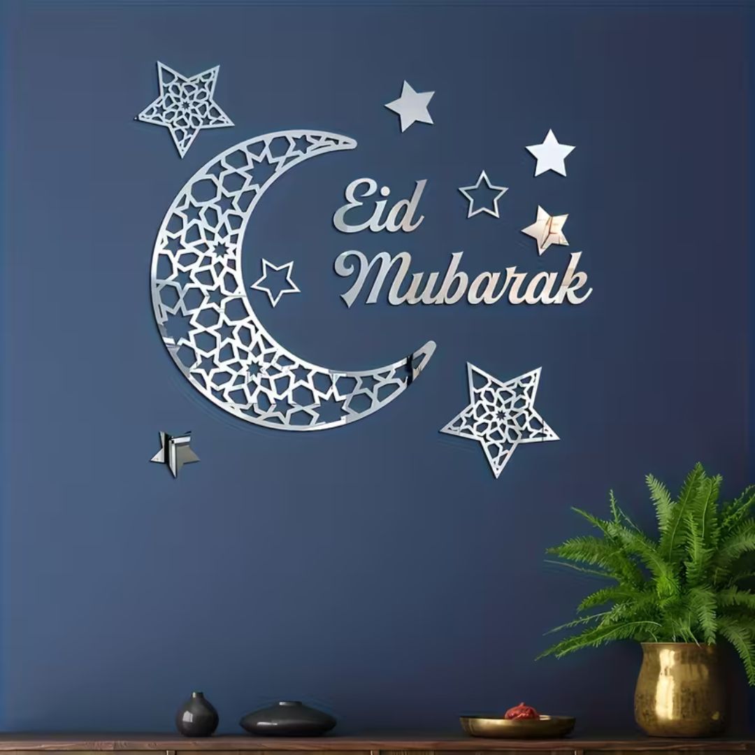 Eid Mubarak Silver Wall Art designed to elevate your home decor with a timeless Islamic touch, perfect for elegant Ramadan decoration and festive interiors.